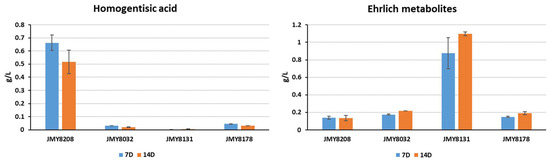 Production of homogentisic acid and Ehrlich metabolites (in g/L) by the four study strains (JMY8032, JMY8131, JMY8178, and JMY8208) in YNB medium. The individual quantities of 2-4OHPE, 4OHPAA, 2PE, and PAA were summed to obtain the total quantity of Ehrlich metabolites. 7D: 7 days of culture; 14D: 14 days of culture.