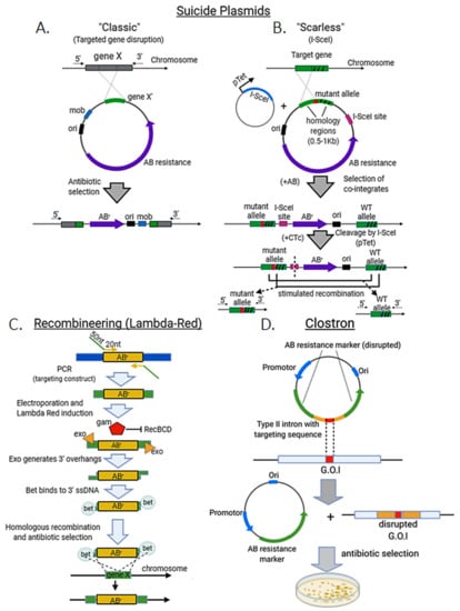 The first method developed were “suicide” plasmids in the 1980s []. Suicide plasmids are those that can replicate in one organism, but not in another called recipient. These plasmids contain a homologous sequence (with the desired insertion, deletion or site-directed mutation) coupled to a marker, usually an antibiotic resistance cassette, and may harbor a transposon sequence that facilitates their insertion into the genome of the recipient strain after conjugation with the donor. As plasmid replication is not possible in the recipient strain or species, antibiotic treatment will select only those colonies that undergo genome integration (“Classical” method, Figure 2A). This strategy however, usually has very low efficiency and can have a high rate of false positives, often requiring two rounds of selection with different antibiotics to achieve edited colonies [,]. It is still used in E. coli, but particularly in other prokaryotic organisms where novel alternatives such as CRISPR-Cas work poorly for large gene deletions/insertions, e.g., Corynebacterium glutamicum [,]. Moreover, site-directed mutants generated by this strategy have been useful for protein purification studies, e.g., a C-terminal truncated, soluble cytochrome c1 in Rhodobacter sphaeroides []. In this case, water-soluble domains of membrane-associated subunits of respiratory complexes usually are more amenable than the native proteins to crystallization for structural studies [].