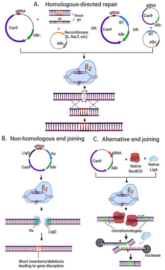 Strategies used for CRISPR-Cas based genome editing in bacteria. (A) Editing via homologous recombination: Recombineering with a linear DNA template is followed by counterselection with CRISPR nucleases. A heterologous recombinase (e.g., λ red, RecT) is introduced via a plasmid (or phage) into the cell and co-transformed with the linear DNA template and CRISPR-nuclease plasmid with respective antibiotic-resistance marker (ABr). Genome editing may also be directed with a plasmid-encoded recombination template (RT) and endogenous or heterologous recombinase. The recombination template can be placed on the same plasmid encoding the CRISPR machinery for an all-in-one plasmid system, or it can be placed on a separate plasmid before transforming the CRISPR nuclease/gRNA plasmid. One-plasmid system is more streamlined, but due to its larger size it can be hard to transform, and cloning may not be possible if the gRNA can target the genome of the cloning strain. (B) Editing via the non-homologous end-joining (NHEJ) pathway. Depending on the strain, ku and/or ligD can be encoded on the CRISPR nuclease/gRNA plasmid and transformed into the strain. (C) Alternative end joining (A-EJ) pathway can be found natively in many bacterial species with incomplete NHEJ. It does not require the introduction of foreign Ku or LigD, and instead relies in microhomology-directed repair via RecBCD, nucleases, and LigA, leading to deletions of variable sizes (depending on the location of microhomologies) at the Cas9 cut site. For a more detailed insight on NHEJ and A-EJ mechanisms, the reader is advised to read []. All strategies require plasmid curing after nuclease targeting to isolate the mutant strain in order to avoid interference in pursuing downstream applications.