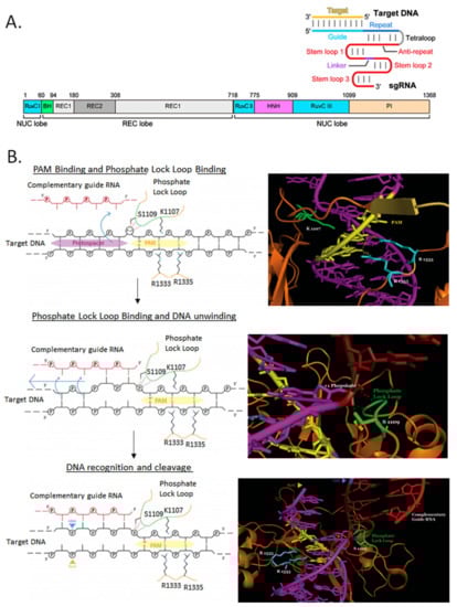 Molecular mechanism of SpCas9/gRNA cleavage of target DNA. (A) The main domains of Cas9 are illustrated next to a gRNA/target DNA secondary structure scheme. Adapted from []. (B) The first step is the PAM binding and phosphate lock loop binding, followed by DNA unwinding and finally the DNA recognition by gRNA and the target DNA cleavage by the RuvC and HNH nuclease domains at both strands. Critical Cas9 residues for each step are illustrated. Adapted from [].