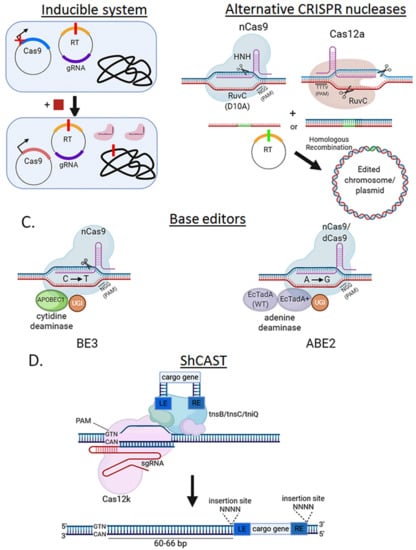 One of the most recent advances in genome editing are the base editors, which specifically perform single-nucleotide edits without a double strand break or recombination template. The most extended base editor, BE3, is composed of a chimera of nCas9 to provide strong, specific gRNA-programmable DNA binding, and cytidine-deaminases, e.g., APOBEC1, to conduct C to T editing in the target gene [] (Figure 5C). Other variants of the system include an adenine-deaminase (A to G conversion) instead of a cytidine-deaminase []. Cas12a [] or dCas9 [] may also be used instead of nCas9. The advantages of these systems include its relative innocuity compared to Cas9-induced DSBs, and its independence from recombination machinery to introduce specific single-nucleotide mutations in a target gene. This system was initially developed in eukaryotes but is becoming more common in some bacteria like E. coli [], Klebsiella pneumonia [], Pseudomonas aeruginosa [], Rhodobacter sphaeroides [], and Staphylococcus aureus []. Recently, however, a transcriptome-wide off-target RNA editing activity has been shown to be triggered by continuous expression of base editors, particularly those based on cytidine-deaminases in mammalian and plant cells []. Similarly, embryonic cells expressing base-editors show a higher than normal frequency of single-nucleotide polymorphisms []. These reports are consistent with the fact that cytidine-deaminases like APOBEC1 and APOBEC3G have a well-documented anti-DNA and anti-RNA virus replication activity, mainly through hypermutating viral genomes [,,,]. Despite the encouraging results using base-editors in bacteria, more research is needed to address these possible caveats in prokaryotes.