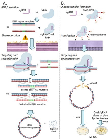 On the other hand, bacteria with thick cell walls such as Gram-positive bacteria can be very difficult to transfect/electroporate. As an alternative, polymer-derivatized Cas9 has been developed []. In this work, direct covalent modification of the protein with a cationic polymer (bPEI) was followed by complexation with a sgRNA to generate nanosized complexes (Figure 6B). Treatment with Cr-nanocomplexes targeting antibiotic resistance inhibited bacterial cell growth on agar plates with oxacillin and demonstrated a higher genome-editing efficiency in methicillin-resistant Staphylococcus aureus (MRSA), compared to incubation with SpCas9/sgRNA RNP alone or combined with Lipofectamine, a traditional cationic lipid formulation which showed almost no effect on S. aureus. The removal of antibiotic resistance genes through this strategy could prove effective for the control of the rising problem of antibiotic resistance, while maintaining commensal bacteria in microbiota. Additionally, novel lipid nanoparticle formulations such as SORT (selective organ targeting) for Cas9 mRNA and sgRNA [], and polyethylene glycol phospholipid-modified cationic LNP for Cas9/sgRNA plasmid [] have shown a high efficiency in mammalian cells. However, it remains to be evaluated if they can also be redirected for genome editing in bacteria.