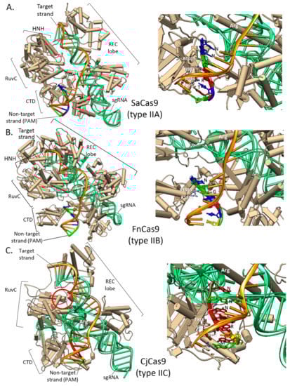 Structures of Cas9 orthologs reveal conserved and divergent features among CRISPR–Cas9 systems (subtypes IIa-IIb-IIc). (A) (Left) Crystal Structure of the SaCas9–sgRNA–target DNA complex (PDB ID 5CZZ): (right) base-specific contacts between CTD domain and PAM nucleotides (NNGR(A or G)R(A or G)T). (B) (Left) Structure of FnCas9–sgRNA–target DNA complex (PDB ID 5B2O); (right) PAM (NGG) recognition by arginine residues of FnCas9 CTD domain. (C) (Left) Structure of CjCas9–sgRNA–target DNA complex (PDB ID 5X2H); (right) base-specific contacts between the CTD domain and PAM nucleotides (NNNV(A or C or G)R(A or G)Y(C or T)M(A or C) in this structure; optimal in vivo PAM has been determined as NNNNRYAC by []). The HNH domain has been deleted for crystallization, the red circle indicates its expected position in the CjCas9 structure []. PDB structures were drawn with UCSF Chimera v.1.14.