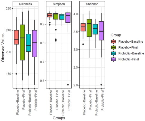 Three different indexes were obtained using vegan package of R: Richness and diversity Shannon and Simpson (Figure 1). Once the normality distribution was confirmed (Shapiro test), the ANOVA test was applied to evaluate the changes between placebo and probiotic groups, resulting in not significant.