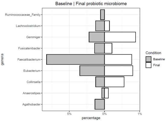 Each of the principal genera was studied individually in order to check if the treatment had some significant effect. First of all, the normality presumption of the data was discarded using a Shapiro-Wilk normality test. All comparisons were produced with non-parametric Kruskal–Wallis test and Wilcoxon rank-sum test. Figure 2 shows the taxa that significantly differed in children consuming a probiotic product. Genera Agathobacter, Faecalibacterium, Fusicanibacter, and Lachnoclostriudium, and one unidentified representative of the Ruminococcaceae family decreased after 12 weeks of probiotic consumption. On the other hand, members of genera Anaerostipes, Collinsella, Eubacterium, and Gemmiger increased their levels. When the effect of probiotic consumption compared to placebo at the final time is analyzed (Figure 3), specific taxa evolution is revealed. Genera Bacteroides, Bifidobacterium, and Ruminococcus significantly increased their levels while Faecalibacterium decreased Conversely, in the case of Bifidobacterium species, presumptive B. longum, B. bifidum, and B. pseudocatenulatum OTUs were the most abundant, but none of them increased significantly in the probiotic group compare to placebo (Kruskal and Wilcoxon test). In the case of Faecalibacterium, F. prausnitzii was identified at the species level.