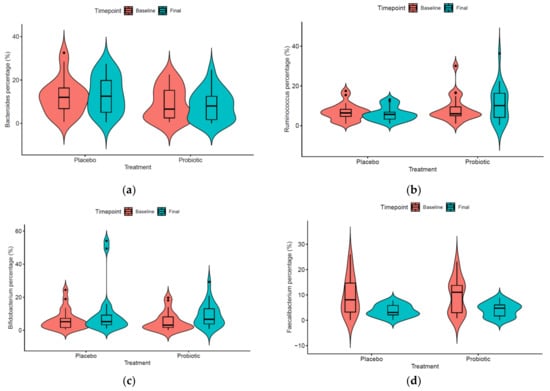 Violin plots showing significant genera comparing the placebo and probiotic groups’ evolution: (a) genus Bacteroides; (b) genus Ruminococcus; (c) genus Bifidobacterium; (d) genus Faecalibacterium.