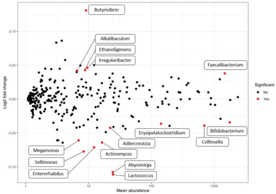 With the aim of detecting specific biomarkers among the 16S rRNA microbiome that could correlate with the SCORAD index, independently of the treatment received and time of sampling, DESeq2 was applied (Figure 4 and Table S3). SCORAD index was used as a continuous numerical covariable in the DESeq2 model, and the resulting log2FoldChange implies the change in each genus when SCORAD increases 1 point, considering both baseline and final data. When we analyzed taxa that directly correlate with SCORAD index (and consequently with AD severity), phylum Actinobacteria was inversely correlated (log2Foldchange = −0.04) and consequently inversely correlated with AD severity score. At family level, none was directly correlated whereas Actinomycetaceae (log2Foldchange = −0.006, p-value < 0.01), Eggerthellaceae (log2Foldchange = −0.04), Selenomonadaceae (log2Foldchange = −0.06) and Bifidobacteriaceae (log2Foldchange = −0.04) were inversely correlated with AD severity, being Bifidobacteriaceae the taxon with highest presence (basemean = 1766.16 sequences). At genus level (Figure 4), Butyrivibrio showed the major log2Foldchange (log2Foldchange = 0.13), and Faecalibacterium showed the highest presence and significant positive correlation with AD severity-microbiome (log2Foldchange = 0.04, basemean 1472.37 sequences). On the contrary, genera Abyssivirga and Lactococcus provided the highest negative correlation (inversely correlated with AD severity), being log2Foldchange = −0.11 in both cases. Bifidobacterium rendered a log2foldchange = −0.03 and the highest basemean among the significant populations (basemean = 1761.01 sequences).