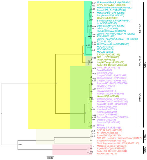 It is also worth noting that some ESA and African GTPVs, including six African GTPVs that were sequenced for this study, were from sheep, showing that these isolates can affect both small ruminant species. In contrast, though only a few GTPVs were available from WCA, we noticed that all of them were exclusively from goats.