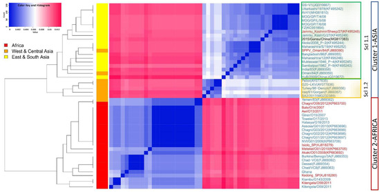 In the heatmap, based on the Euclidian distances calculated from the k-mer frequencies of each pair of sequences, we observed two main clusters: cluster 1 comprised isolates from Asia and cluster 2 comprised isolates from Africa (Figure 2). Cluster 1 with Asian GTPVs further split into two sub-clusters: sub-cluster 1.1 comprising ESA GTPVs and sub-cluster 1.2 containing WCA GTPVs (Figure 2). In general, all GTPVs clustered according to their geographical origins, except GTPV Yemen/83 (FJ869390) from Western Asia, located within cluster 2 of African GTPVs and GTPV Oman/84(FJ869359) and SPPV Oman/84 (FJ869390), also from Western Asia, located in sub-cluster 1.1 of ESA GTPVs (Figure 2). Contrasting with the result of the phylogenetic reconstruction, GTPV SA2/2017 (MG232389) clustered within sub-cluster 1.1 of WCA GTPVs (Figure 2).