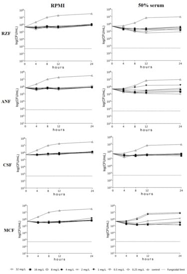 The killing activity was determined in RPMI-1640 with and without 50% human serum at concentrations 1–32 mg/L and at 0.25–32 mg/L, respectively, in a final volume of 10 mL []. These echinocandin ranges were based on previous pharmacokinetic data with standard doses of currently approved echinocandins among intensive care unit patients [,,] and Phase 1 data for rezafungin []. The starting inocula were 2.5–7 × 105 CFU/mL. Aliquots of 100 mL were removed at 0, 4, 8, 12, and 24 h, serially diluted ten-fold, plated (4 × 30 mL) onto a single Sabouraud dextrose agar, and incubated at 35 °C for 48 h. All experiments were performed in both media twice [].