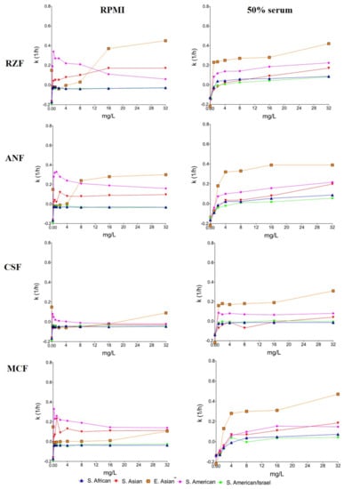 Another explanation for the weak fungistatic effect of echinocandins is that decreased amount of β-glucan induces a variety of stress adaptation pathways resulting in increased cell wall chitin [,,,]. Increased chitin content helps to stabilize the fungal cell wall, therefore mitigating the impact of echinocandins. Although this adaptive response does not lead to mutations in the FKS genes, the early adaptation to echinocandin exposure enhances survival of the drug effect and may allow the development of stable resistance mechanisms over time for surviving cells, possibly leading to clinical resistance in the long run [,,]. The mini-paradoxical effect in RPMI-1640, which disappeared in the case of some isolates in the presence of serum, may represent such adaptation. The high protein binding decreases the free (i.e., active) echinocandin concentration as modeled by the presence of 50% serum, which is mirrored in elevated MICs []. Lower free drug levels induce less compensatory chitin synthesis; thus, higher k values at higher concentrations with serum may be explained by the enhancement of the killing activities of echinocandins due to lower cell wall chitin, compared to RPMI-1640 (Figure 2) [,]. Although chitin content was not measured in our study, other authors found elevated chitin content in C. auris, compared to other species more susceptible to echinocandins []. Furthermore, fast increase of chitin content in response to caspofugin was reported with caspofungin-resistant but not caspofungin-susceptible C. auris isolates [].
