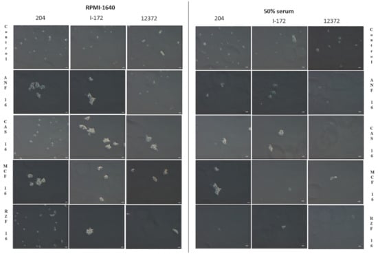 Echinocandin-treated C. auris cells in RPMI-1640 frequently showed large (20–30 µm in diameter) aggregates with up to 100 cells, regardless of the clade. Neither the number nor the size of the aggregates was dependent on the echinocandin or its concentration (i.e., any echinocandin at 1 or 16 mg/L was able to induce large aggregates). In 50% serum, the number and size of aggregates decreased significantly at both concentrations. Abnormal cell morphology and cell debris were typical after 24 h at 16 mg/L regardless of the echinocandin or clade (Figure 3).