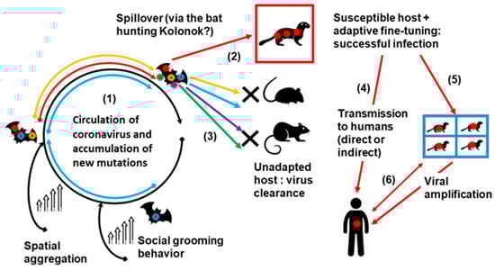 There are currently two models for viral emergence [,,]. The accepted worldwide linear spillover model postulates that an animal reservoir species producing a very high level of the virus must be at the origin of zoonosis []. The emergence occurs when the pathogens spill over from the reservoir to inundate other species. This zoonotic pressure triggers a high-frequency infection in humans. Consequently, the animal reservoir species should carry the same virus as the one causing the epidemic. More recently, another model was proposed, based on the idea that there is no need for either a reservoir nor an intermediate species. In this non-linear model, named the circulation model [,], there are only susceptible hosts and resistant hosts, regardless of the species (humans are only one species among others). In the circulation model, a virus’s capacity to infect a novel host is determined by the contact between species and minimal receptor compatibility. Many species can be susceptible in the virus circulation model, as demonstrated by SARS-CoV-2.