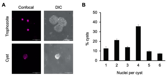 To assess the percentage of cysts with four or more nuclei, nuclei counts were performed on 100 cysts each from three biological replicates (Figure 1B). Slightly over half of all cysts had four or more nuclei present (52.3 ± 3.3% with 4–6 nuclei) and approximately two-thirds (66.3 ± 2.6%) had three or more nuclei. The average number of nuclei present was 3.3 ± 0.1. Although not all cysts were tetranucleate, this heterogeneity is consistent with previous reports that E. invadens cysts have an average of four nuclei and are a mixture of primarily tri- and tetranucleate cells [40,42].