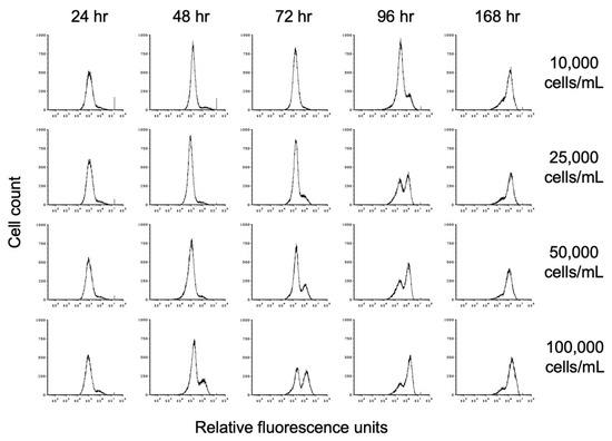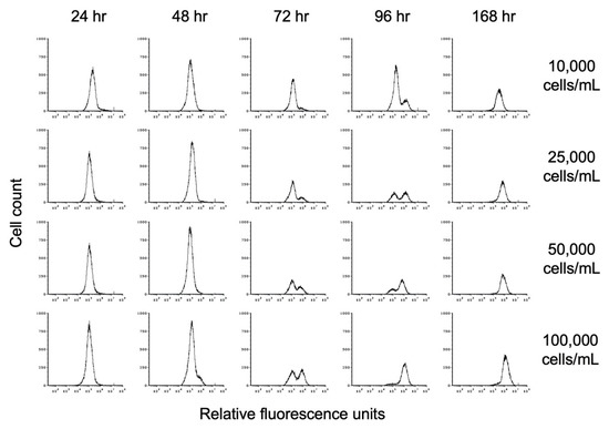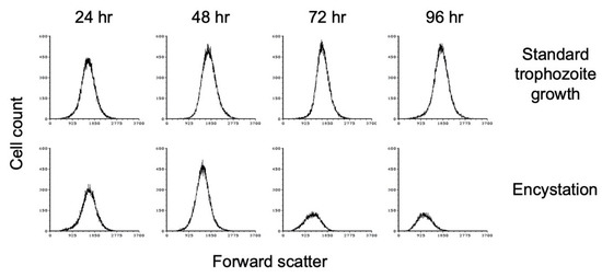 The progression toward encystation was monitored by the disappearance of the lower fluorescence intensity (left) trophozoite peak and the appearance of the higher fluorescence intensity (right) cyst peak, indicating the deposition of the chitin cell wall during encystation. The histograms shown in Figure 5 demonstrate the progression of encystation over time at different starting cell densities. The results from one of the three biological replicates are shown. The rate of appearance and increase in size of the cyst peak corresponds to starting cell density, with the cyst peak appearing earlier in cultures with higher starting cell density than in cultures with lower starting cell density. As the size of the cyst peak increased, that of the trophozoite peak decreased. By 168 h, only the cyst peak was present regardless of starting cell density.