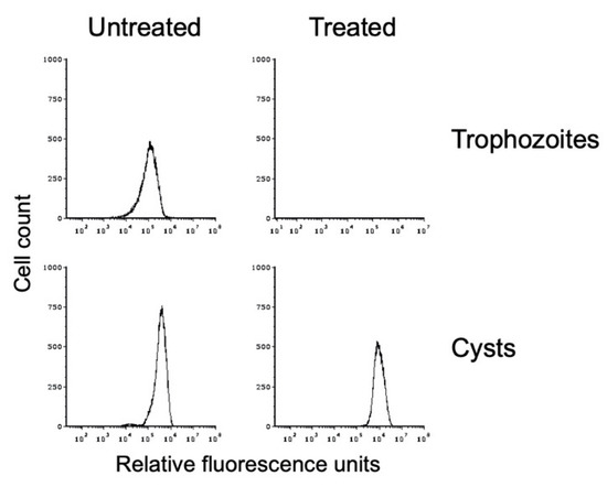 - Welter, B.H.; Sehorn, M.G.; Temesvari, L.A. Flow cytometric characterization of encystation in Entamoeba invadens. Mol. Biochem. Parasitol. 2017, 218, 23–27. [Google Scholar] [CrossRef] [PubMed]