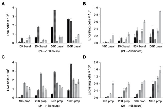Examination of live cell count revealed that TYI propionate cultures did not experience the same die-off as observed for the TYI basal cultures (Figure 6C). TYI propionate cultures experienced a lesser die-off starting between the 72 and 96 h time points and continuing through the 168 h time point. Additionally, unlike the case for encystation in TYI basal medium, the number of encysting cells increased steadily throughout the entire 168 h period (Figure 6D). This resulted in a higher number of cysts produced in TYI propionate medium versus TYI basal medium at all starting cell densities (Table 1). When cyst production was normalized versus starting cell number, the encystation rate for the 10K basal and 10K prop cultures was significantly higher than that for the respective 25K, 50K, and 100K cultures. The results also showed that the encystation rate was significantly higher in the presence versus absence of propionate across all starting cell densities (Table 1). Overall, comparison of the results observed in the absence versus presence of propionate indicates that propionate has a pronounced effect on encystation and greatly increases the number of cysts produced and the overall rate of encystation.