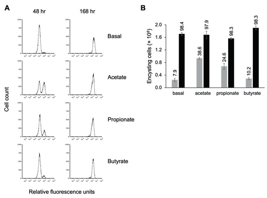 Having demonstrated that the presence of propionate resulted in earlier entry into encystation, we were interested in whether other SCFAs influenced encystation as well. Visual inspection of TYI basal cultures supplemented with acetate indicated that cells entered encystation earlier, as judged by the appearance of cells with the small, rounded morphology of cysts. To examine this more closely, cultures were inoculated at 50,000 trophozoites/mL in TYI basal medium or TYI basal medium containing 62 mM acetate, 24 mM propionate, or 23 mM butyrate, representing concentrations similar to those found in the colon [53]. Cells were harvested, stained with WGA-488, and analyzed by flow cytometry to determine how many cells had begun encysting by 48 h and the overall final number of cysts produced by 168 h. Representative histograms are shown in Figure 8A, and quantitative results from three biological replicates are shown in Figure 8B.