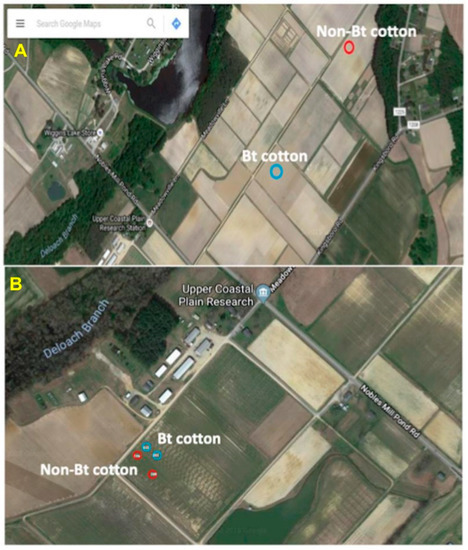 Helicoverpa zea collection sites at the Upper Coastal Plain Research Station, Rocky Mount, NC (USA). (A) Larvae were collected from two adjacent fields in the fall of 2016 from non-Bt and Bt (WideStrike, Cry1Ac + Cry1F) cotton; (B) larvae were collected from adjacent plots in the same field as indicated in the figure in the fall of 2018.