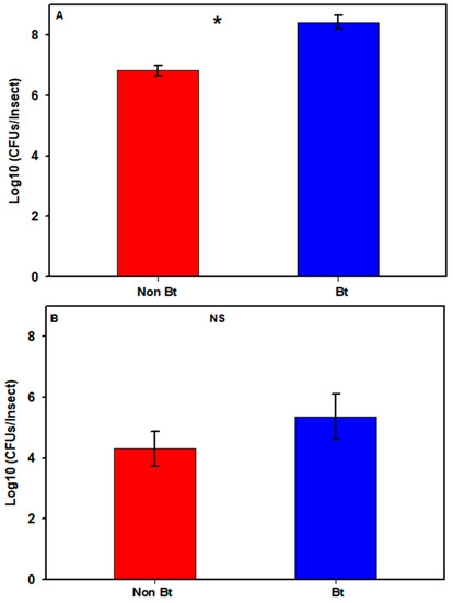 Cultivable bacterial loads in H. zea larvae from non-Bt cotton versus Bt cotton (WideStrike) from the field. (A) 2nd to 3rd stadium larvae collected in August 2016; (B) 3rd stadium larvae collected in August 2018. Each bar represents the mean number of Colony Forming Units + SE. Presence of an asterisk indicates significant difference between the two groups (p < 0.05; Mann–Whitney U-test); NS = non-significant difference (p > 0.05; Mann–Whitney U-test).