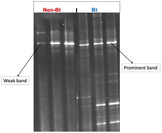 DGGE was conducted using the 16S rRNA gene to obtain a coarse-scale analysis of the bacterial community diversity (species richness + evenness) of the bollworms collected from Bt versus non-Bt cotton in season 1. Each band shown on the gel image (Figure 3) represents at least one unique phylotype (OTU = operational taxonomic unit = bacterial species). The number of DGGE-DNA bands reflects the species richness in a sample while the intensity of the band in DGGE relates semi-quantitatively to species abundance [51]. The results confirmed the trends observed during bacterial culturing and provided additional information about bacterial diversity in the samples. Bollworms collected from non-Bt cotton had 1–2 prominent bands and 4–6 weak bands (Figure 3) while bollworms from Bt had 2–3 prominent bands with 10–12 weak bands (Figure 3). These results suggest that the insects from the two treatments had different microbial diversity (richness + abundance) profiles.