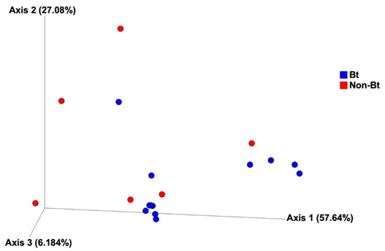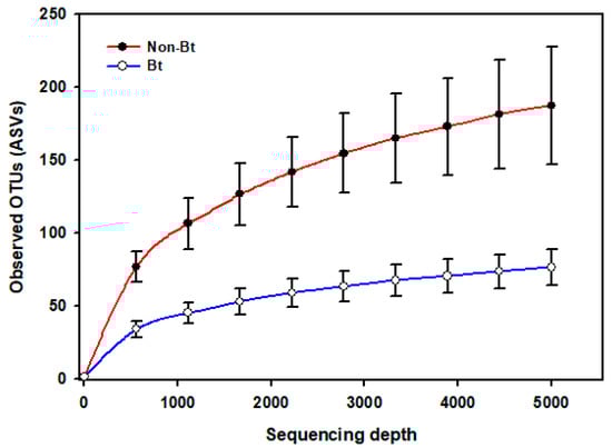 After quality filtering, low-sequence samples were removed from the data and not processed during the subsequent analyses. These samples were defined as samples with <5000 sequence reads. Thus, a total of 1,667,663 16S rRNA gene sequences were obtained from 18 16S rRNA gene libraries (6 for non-Bt and 12 for Bt) after quality filtering using DADA2 with an average of 92,648 reads. The reads obtained after quality filtering were clustered into 2301 sequence variants and assigned to 15 phyla, 103 families, and 229 genera.