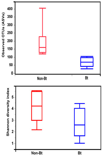 Statistical analyses for alpha and beta diversities were conducted in QIIME2. The statistical significance of alpha diversity between groups (Bt and non-Bt) was inferred using pairwise Kruskal–Wallis H-tests. To estimate β-diversity between the two groups (Bt and non-Bt), we used the weighted Unifrac distance metric [50]. For beta diversity, a PERMANOVA test was run to determine if there was any difference between the two treatments. For a given bacterial taxa of interest, the statistical difference between the two groups (Bt and non-Bt) was determined with a Mann–Whitney U-test using the R statistical software.