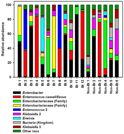 Overall, the most sequence-abundant bacterial taxa (abundance ≥3% across samples) at the phylum level were Proteobacteria (67.80%) and Firmicutes (27.26%) (see Supplementary S2 File). We found two families to be the most abundant across all samples: Enterobacteriaceae and Enterococcaceae. Enterobacteriaceae accounted for ~60% of the reads in both groups (non-Bt cotton versus Bt) (see Supplementary S2 File). The largest difference between the two groups was observed with Enterococcaceae even though no statistical difference was obtained (Mann–Whitney U-test, p = 0.553). In fact, 30% of the reads in the WideStrike (Bt) samples belonged to Enterococcaceae compared to 15% of the reads in non-Bt cotton (a 2-fold difference, see Supplementary S2 File). At the highest taxonomic resolution (species level), most taxa were classified up to the genus level (Figure 7; see Supplementary S2 File). At this level, four genera were identified as the most sequence-rich taxa: Enterococcus (with two species), Klebsiella (with three species), Enterobacter, and Erwinia (Figure 7; see Supplementary S2 File). Enterococcus casseliflavus (20% in Bt versus 15% in non-Bt) and a second non-identified Enterococcus species (9.5% in Bt versus 0.58% in non-Bt) were more abundant in WideStrike samples. Klebsiella oxytoca (the most abundant Klebsiella species identified) was also highly present in WideStrike samples (12% of the reads vs. 2% for non-Bt cotton). Enterobacter was the most abundant genus detected in our samples and comprised 19% of the reads in non-Bt cotton and 28% of the reads in WideStrike (Bt) (Figure 7; see Supplementary S2 File). Four percent of the reads (across all samples) were only classified to the Kingdom level as “bacteria” (Figure 7; see Supplementary S2 File).