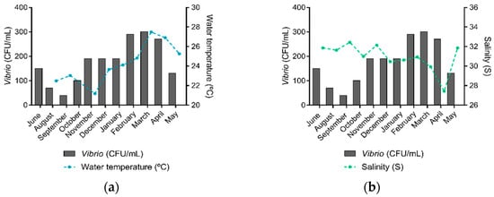 - Baker-Austin, C.; Trinanes, J.; Gonzalez-Escalona, N.; Martinez-Urtaza, J. Non-Cholera Vibrios: The microbial barometer of climate change. Trends Microbiol. 2017, 25, 76–84. [Google Scholar] [CrossRef] [PubMed]