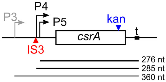 csrA locus and csrA mRNAs. The 186 bp long open reading frame (ORF; box) of the csrA gene and the transcription start sites for P3, P4, and P5 promoters (bent arrows) located 137, 62, and 53 bp upstream of the ATG start codon, respectively, are represented [13]. Red and blue arrowheads, insertion points of IS3 in C-1a and of the kanR cassette in the csrA::kan mutants [14,15]. The region between positions +8 and +37 downstream of the csrA stop codon (t) was identified as a putative termination site [16]. mRNAs originating from P3 (gray line), P4, and P5 (black lines) and terminating at +37 with respect to the csrA stop codon are reported with their predicted length.