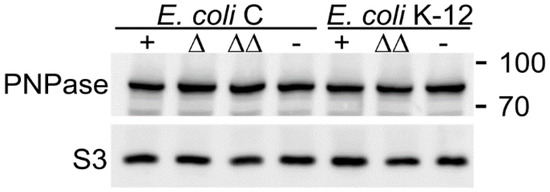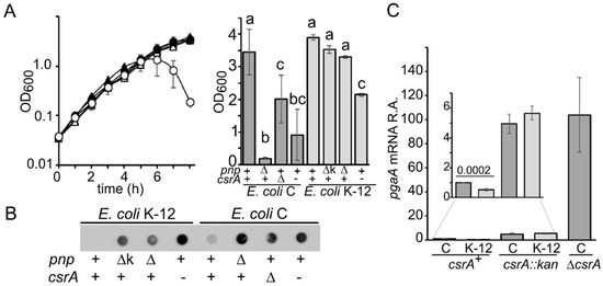 It was reported that CsrA regulates PNPase translation by binding to pnp mRNA 5′-UTR [46]. However, the PNPase level was the same between E. coli C and K-12 and also between csrA+ and csrA mutants (Figure 3). Thus, the higher impact of PNPase on pgaABCD regulation in E. coli C vs. K-12 does not depend on differences in pnp expression.