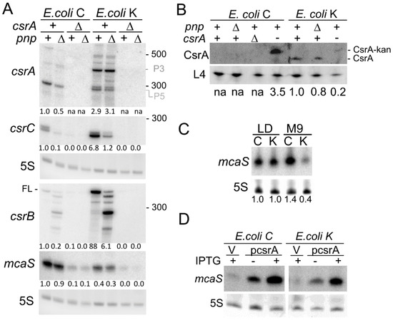 Expression of csrA, csrB, csrC, and mcaS.