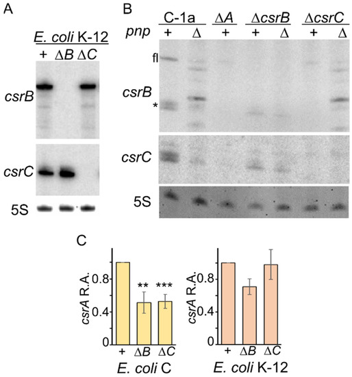 The Δpnp mutation had similar effects on CsrB, CsrC, and McaS in E. coli C and K-12 strains. It decreased CsrC and, to a lesser extent, McaS sRNAs abundance. Concerning CsrB, a nearly identical RNA pattern was found in E. coli C and K-12 Δpnp strains, with a strong reduction in the full-length RNA and accumulation of shorter species (Figure 4A and Table 3). Hybridization with oligonucleotides complementary to either the CsrB 5′- or the 3′-end (Supplementary Figure S3B) confirmed that these RNAs are CsrB degradation products mainly shortened at the 3′-end as already found in E. coli K-12 and Salmonella [50,51].