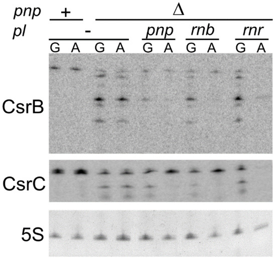 As shown in Figure 6, we found that ectopic expression of all exonucleases caused the complete disappearance of signals corresponding to CsrB and CsrC degradation products, but only PNPase and RNase II partially restored CsrB and CsrC full-length production, whereas RNase R did not.