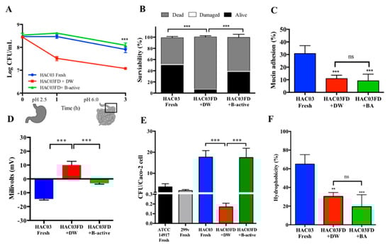 Comparison of freeze-dried Lp. plantarum HAC03 probiotic properties under different rehydration conditions. (A) Viability of Lp. plantarum HAC03 freeze-dried cells rehydrated in the presence of B-active (green line), without B-active (red line), and overnight cultured cells (blue line) after simulation of the GIT passage by plate counting. (B) Real-time Lp. plantarum HAC03 viability determined by flow cytometry and the exclusion method with propidium iodide. (C) Lp. plantarum HAC03 mucin adhesion, (D) zeta potential, (E) adhesion to Caco-2 cell line, and (F) hydrophobicity after rehydration with B-active formulation. Lp. plantarum ATCC14917 and Lp. plantarum 299v fresh overnight cultured cells were used as a reference and probiotic control, respectively. The experiments were carried out after rehydration and ten-fold dilution of the samples. Statistical differences were compared to HAC03 freeze-dried cells rehydrated with distilled water by one-way ANOVA and Dunnett’s multiple comparisons test, where ** p < 0.01, and *** p < 0.005.