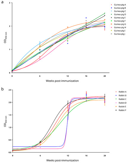 Ten guinea pigs (A–J) and six rabbits (A–F) were immunized with inactive SARS-CoV-2 virions. All immunized animals developed immune responses and generated anti-SARS-CoV-2 antisera. Indirect ELISA based on the recombinant SARS-CoV-2 N protein showed that for both guinea pigs and rabbits, the serum level of anti-SARS-CoV-2 antibodies prior to immunization was insignificant (Figure 1). For guinea pigs, anti-SARS-CoV-2 antibodies were generated starting around 6 weeks post-immunization and their levels began to reach a plateau at 20 weeks post-immunization (Figure 1a); whereas for rabbits, antibody levels began to increase between 6–12 weeks post-immunization and reached a plateau at 16 weeks post-immunization (Figure 1b).