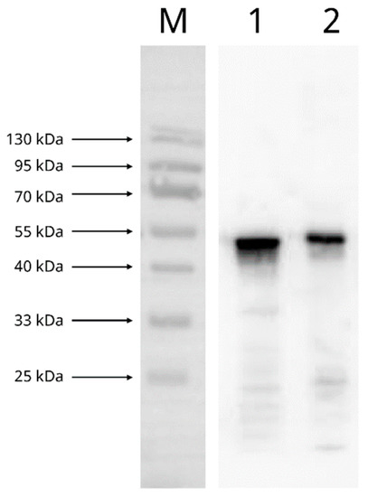 Figure 2. Western blot showing the reactivity between the recombinant SARS-CoV-2 nucleocapsid (N) protein and the mouse anti-SARS-CoV-2 N protein monoclonal antibody with inactive SARS-CoV-2 virion as the positive control. Lane M, protein marker; lane 1, inactive SARS-CoV-2 virion; lane 2, recombinant SARS-CoV-2 nucleocapsid protein.