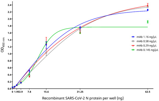Figure 3. Specificity of the mouse anti-SARS-CoV-2 nucleocapsid (N) protein monoclonal antibody (mAb) at various concentrations to different amounts of the SARS-CoV-2 N protein as determined by an in-house developed recombinant SARS-CoV-2 N protein-based indirect enzyme-linked immunosorbent assay. The best fit curves were generated by the Boltzmann sigmoid equation. OD450nm, optical density at 450 nm.