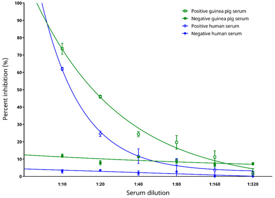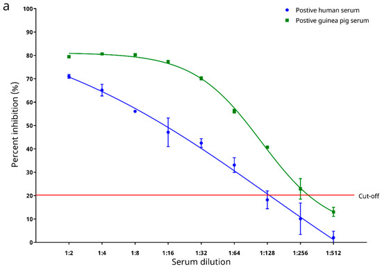 Two positive and two negative sera from Panel 1 were used to test for the analytical sensitivity of the cELISA. The highest dilutions for specific detection of serum anti-SARS-CoV-2 antibodies were determined to be 1:64 for the positive human serum, and 1:256 for the positive guinea pig serum (Figure 6a) using the PI cut-off value of 22.345%.