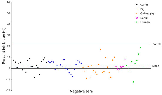 The PI cut-off value of the cELISA was determined using 74 negative serum samples from humans/animals free from COVID-19. For these samples, the PI values ranged from −12.432% to 18.574%, with a mean PI of 1.936% and an SD of 5.831% (Figure 5). Hence, the PI cut-off value was determined as 1.936% + 3.5 × 5.831% = 22.345%. Using this cut-off value, all negative samples possessed PI values below the cut-off (Figure 5).