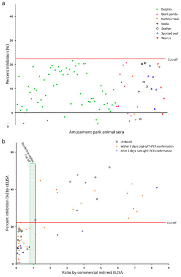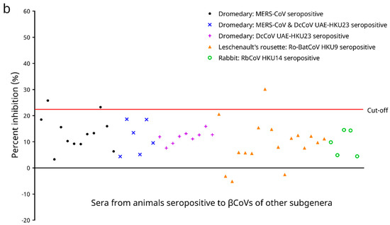 Figure 6. (a) Determination of analytical sensitivity of the in-house developed recombinant SARS-CoV-2 nucleocapsid (N) protein-based competitive enzyme-linked immunosorbent assay (cELISA). The best fit curves were generated by 4-parameter logistic regression. (b) Distribution of percent inhibition values for 49 serum samples from animals seropositive to betacoronaviruses (βCoVs) other than Sarbecovirus, including: dromedary (Camelus dromedarius) serum samples seropositive to Middle East respiratory syndrome-related coronavirus (MERS-CoV); dromedary serum samples seropositive to both MERS-CoV and dromedary camel coronavirus UAE-HKU23 (DcCoV UAE-HKU23); dromedary serum samples seropositive to DcCoV UAE-HKU23; Leschenault’s rousette (Rousettus leschenaulti) serum samples seropositive to Rousettus bat coronavirus HKU9 (Ro-BatCoV HKU9); and rabbit (Oryctolagus cuniculus) serum samples seropositive to rabbit coronavirus HKU14 (RbCoV HKU14), as determined by the in-house developed recombinant SARS-CoV-2 nucleocapsid protein-based competitive enzyme-linked immunosorbent assay (cELISA).