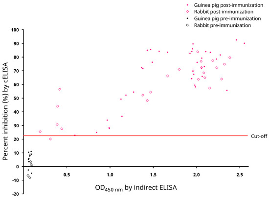 Figure 7. Distribution of percent inhibition (PI) values for 75 serum samples from laboratory animals pre- and post-immunization with the inactive SARS-CoV-2 virion as determined by the in-house developed recombinant SARS-CoV-2 nucleocapsid (N) protein-based competitive enzyme-linked immunosorbent assay (cELISA). The PI values were compared with their respective absorbance values determined by an in-house developed recombinant SARS-CoV-2 nucleocapsid protein-based indirect ELISA as shown in Figure 1. OD450nm, optical density at 450 nm.