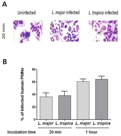 2.5. In Vitro Infection of Human PMNs by L. major and L. tropica Promastigote Strains