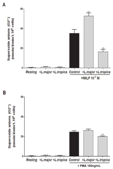 Effect of L. major and L. tropica promastigote strains on O2− production by human PMNs. PMNs (106/mL) were infected at 5:1 ratio for 20 min at 37 °C. The cells were incubated in the presence or absence of fMLF (10−7 M) or PMA (100 ng/mL). As a control, uninfected and nonstimulated PMNs (Resting), and uninfected and stimulated PMNs (Control) were used. Superoxide anion production was measured by the SOD-inhibitable cytochrome C reduction assay by the end-point method. The superoxide anion production was expressed as nmole/min/106 cells in the presence or absence of fMLF (A), or PMA (B). Results are expressed as mean ± SEM from three independent experiments, each performed in duplicate. Data were analyzed using a one-way ANOVA test with Tukey’s post-hoc test for multiple comparisons. ** p < 0.01.