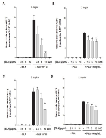 While L. tropica SLA significantly inhibited O2− production induced by fMLF or PMA at higher concentration (10 µg/mL) (Figure 3C,D), the L. major SLA inhibited this production in a concentration-dependent manner (2.5 µg/mL, 5 µg/mL, and 10 µg/mL) (Figure 3A,B).