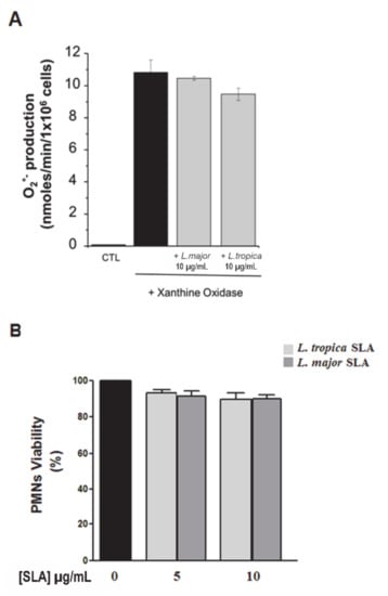 Because previous studies have reported that L. donovani has a high effective capacity in scavenging hydroxyl radicals and superoxide anion [,,], we then determined whether the inhibitory effect of L. major and L. tropica SLAs on human PMNs superoxide anion production was related to potential O2− scavenging properties. We quantified the production of superoxide anion in a cell-free xanthine/xanthine oxidase assay in the presence or absence of SLAs. The results showed that L. major and L. tropica SLAs had no scavenging effect at the highest concentration used (10 μg/mL) (Figure 4A). Furthermore, this inhibition was not related to PMN death as assessed by a trypan blue dye exclusion assay (Figure 4B). Thus, our results showed that fMLF and PMA, in inducing O2− production by PMNs, were differently modulated by promastigotes and SLAs.