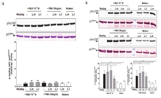 It is well known that phosphorylation of p47phox on several serine residues, especially Ser328, is crucial for NADPH oxidase assembly and activation []. Although we observed a phosphorylation on Ser328 of p47phox, upon PMN infection with promastigotes, this was not associated with O2− production, suggesting that other processes are probably missing for full NADPH oxidase activation following infection with live parasites. Furthermore, previous studies have shown that phosphorylation of p47phox on Ser345 is a key event for the priming process, as it allows prolylisomerase Pin1 binding, which then acts as a molecular switch to facilitate the assembly of NADPH oxidase in human PMN [,]. However, in the present study, L. major promastigote did not affect Ser345 phosphorylation on p47phox. Thus, it may induce NADPH oxidase priming through other mechanisms such as an increase in intracellular calcium or lipids messengers, such as arachidonic acid or phosphatidic acid, thereby favoring the assembly of the enzyme []. This effect could also include phosphorylation of p47phox on other sites, translocation of p47phox and/or p67phox to the membrane, fusion of specific granules to the phagosome, or activation of the small G protein Rac 2. Moreover, only live parasites were able to induce p47phox phosphorylation since their respective SLAs did not.