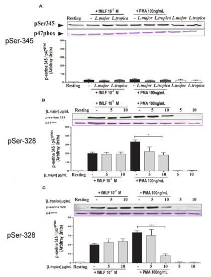 PMNs (4 × 106cells) were infected with L. major or L. tropica promastigotes at a 5:1 ratio for 20 min at 37 °C, and then stimulated with fMLF (10−7 M) or PMA (100 ng/mL) at 37 °C. PMNs were also incubated at 37 °C for 20 min with or without increasing concentrations of SLAs. The reaction was stopped by adding 125 μL of 5× concentrated modified Laemmli sample buffer containing 12.5 mM Na3VO4, 25 mM NaF, 6.25 mM p-NPP, 12.5 mM EDTA, 12.5 mM EGTA, 50 μg/mL leupeptin, 50 μg/mL pepstatin and 50 μg/mL aprotinin. Samples were then denatured in boiling water (100 °C, 5 min) and stored at −80 °C until Western blotting analysis. Upon thawing, samples were sonicated twice for 5 s and subjected to 11% SDS–PAGE (equivalent of 4 × 105 cells per well) using standard techniques. The separated proteins were transferred to nitrocellulose membranes. After saturation with 5% milk in Tris-buffered saline containing 0.1% Tween 20 (TBS-T 0.1%) for 1 h, the membranes were probed with an anti-phospho-Ser345-p47phox (1:5000), or an anti-phospho-Ser328-p47phox (1:5000), which were produced as previously described [,]. After overnight incubation at 4 °C and washing with TBS-Tween 0.1%, the membranes were incubated with the corresponding secondary antibody, i.e., HRP-labelled goat anti-rabbit antibody (1:10,000), or AP-labelled goat anti-rabbit antibody (1:10,000). The protein bands were revealed using enhanced chemiluminescence (Santa Cruz, Heidelberg, Germany, sc-2048) when HRP-conjugated secondary antibodies were used. For the AP-conjugated secondary antibodies, the bands were revealed by adding the AP substrate containing 0.015% of BCIP (5-bromo-4-chloro-3-indolyl phosphate) and 0.3 mg/mL of NBT (nitrobluetetrazolium) in 0.1 M carbonate buffer containing 1 mM MgCl2.