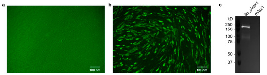 Sp_pVax1 and pVax1 Plasmid Expression. Immunofluorescence assay (IFA) on BHK-21 cells transfected with (a) pVax1 or (b) Sp_pVax1. Cells were permeabilized and probed with primary anti-V5 antibody and secondary fluorescent antibody at 24 h post transfection to visualize spike protein-positive cells. BHK cell lysate was collected at 24 h post transfection and evaluated via (c) western blot to detect appropriately sized spike protein at 180–200 kDa (upper bright band) and cleavage product (lower light band).