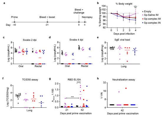 After confirming in vitro expression of the SARS-CoV-2 spike we next evaluated the vaccine in protection against virus challenge in the Syrian hamster disease model [15] following a prime-boost regimen. Hamsters were divided into three spike-vaccinated groups and one non-spike vaccinated control group (Empty). Hamsters received either Sp_pVax1 via IM injections with 100 µg of DNA diluted in saline (Sp-Saline IM), IM with 50 µg of DNA complexed to in vivo delivery reagent (Sp-complex IM), or IN with 50 µg of DNA complexed to in vivo delivery reagent (Sp-complex IN). Lower quantities of DNA were delivered with the in vivo reagent compared to the Sp-saline IM group due to maximum injection volumes and animal welfare considerations. Control hamsters received any one of the three spike-vaccination formulations with empty pVax1 and were pooled for analyses. An identical boost vaccination was given 3 weeks post-prime, and hamsters were challenged IN three weeks post-boost with 1000 TCID50 of SARS-CoV-2 (ID50 = 5 TCID50 [15]) (Figure 2a). As the SARS-CoV-2 hamster model is not lethal [15], we performed a timed necropsy on 4 days post infection (dpi).